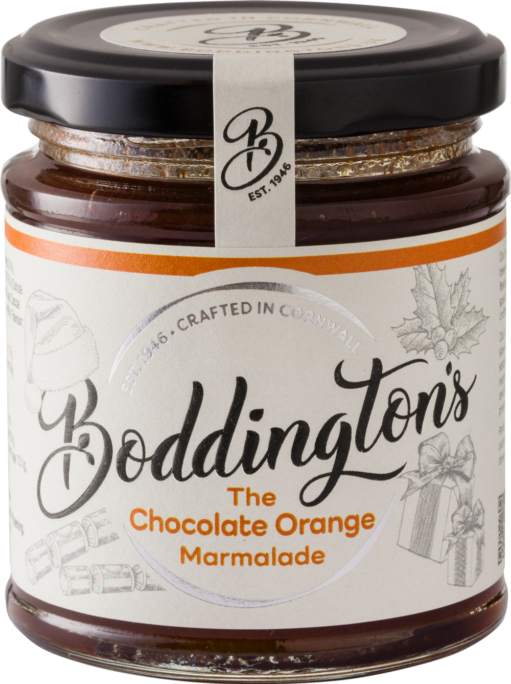 Our traditional Orange Marmalade has been infused with rich chocolate for a festive and indulgent flavour; Boddington's special Chocolate Orange Marmalade is crafted on our family farm in Mevagissey. Using our cherished traditional recipe, our decadent marmalade is meticulously slow-cooked in small batches to its perfect setting point. We're proud of the high fruit content and luxurious chocolate, with no artificial preservatives or any added pectin. Perfect for spreading on warm crumpets or adding a festive twist to your Christmas desserts.