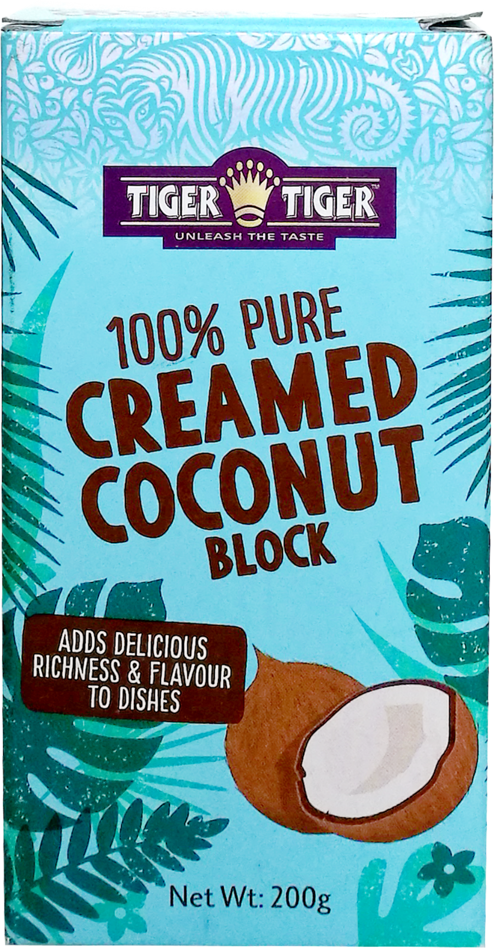 Tiger Tiger Creamed Coconut Block offers rich, velvety coconut goodness for curries, desserts and more, ensuring a luscious tropical flavour.