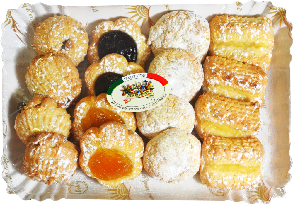 A delicious selection of Italian pastries. Contains Petit Fleur, Apricot Bauletti, Brutti e Buoni, Chocolate Dipped Ferri, Chocolate Gocce, Cherry and Apricot Margherite, Apricot Delizia, Lemon Cuscini.
