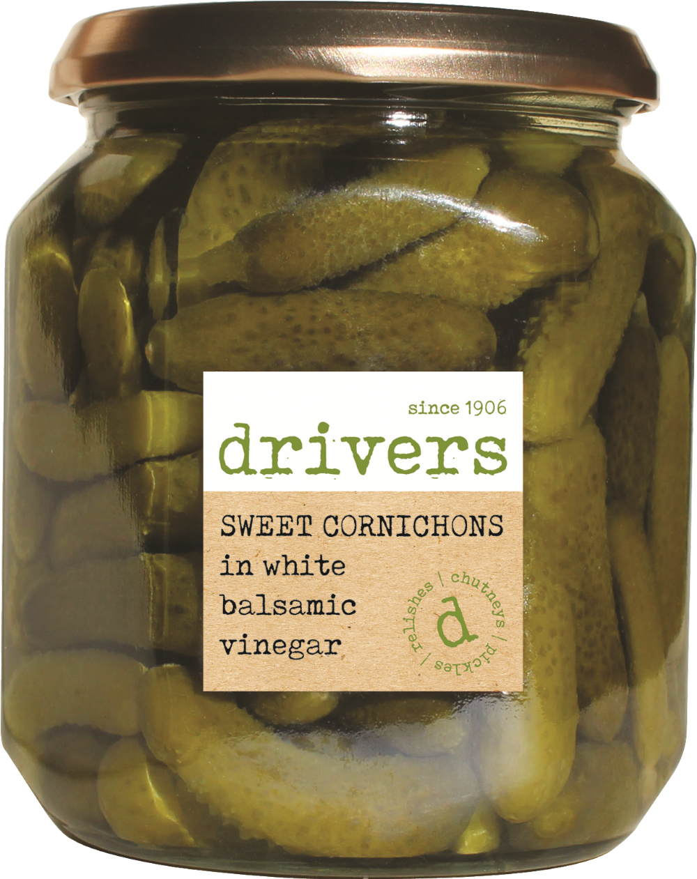 Drivers Sweet Cornichons in White Balsamic Vinegar 550g