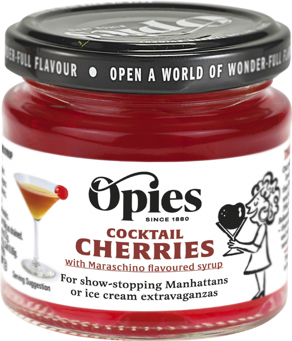 Opies cocktail cherries are used by bartenders, mixologists and chefs around the world to add the final flourish to cocktails and desserts. Flavoured with alcohol-free maraschino flavouring. When using in cakes remember to give them a light coating of flour so they don't all end up at the bottom.