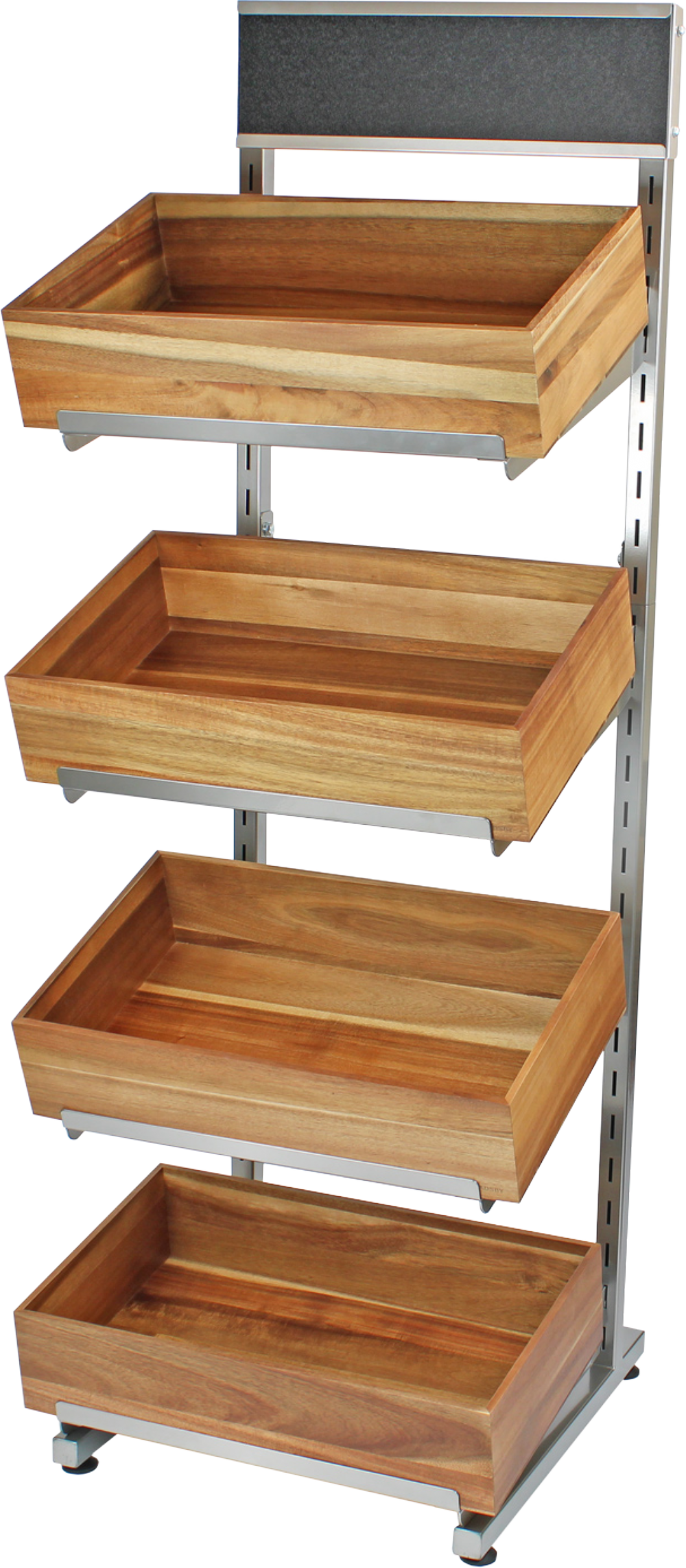 The four 1/1 GN Acacia wooden crates included in the kit are made from durable Acacia wood. Its resistance to wear and tear and heavy use make it an excellent choice for retail displays. Its size means it fits perfectly on our freestanding display stand. A versatile choice for any shop, use for hot (with a Gastronorm tray) and cold food as well as general merchandising.