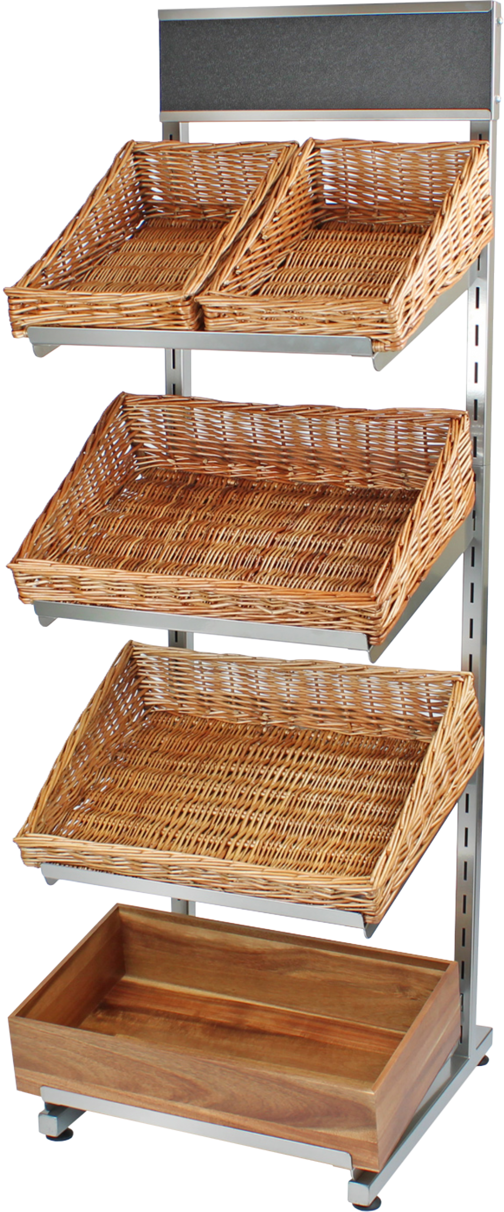 Within this kit you'll also receive a variety of crates and baskets. You will get one 1/1 GN Acacia Wooden Crate, two 25cm sloping baskets and two 50cm sloping baskets. The mix of metal and natural materials make for an engaging display for your customers. The sloping wicker baskets allow the customer to see your products clearly. Whilst the acacia wooden crate works perfectly as the bottom shelf. Display a range of merchandise including fruit and vegetables, bakery items, gifting and more.