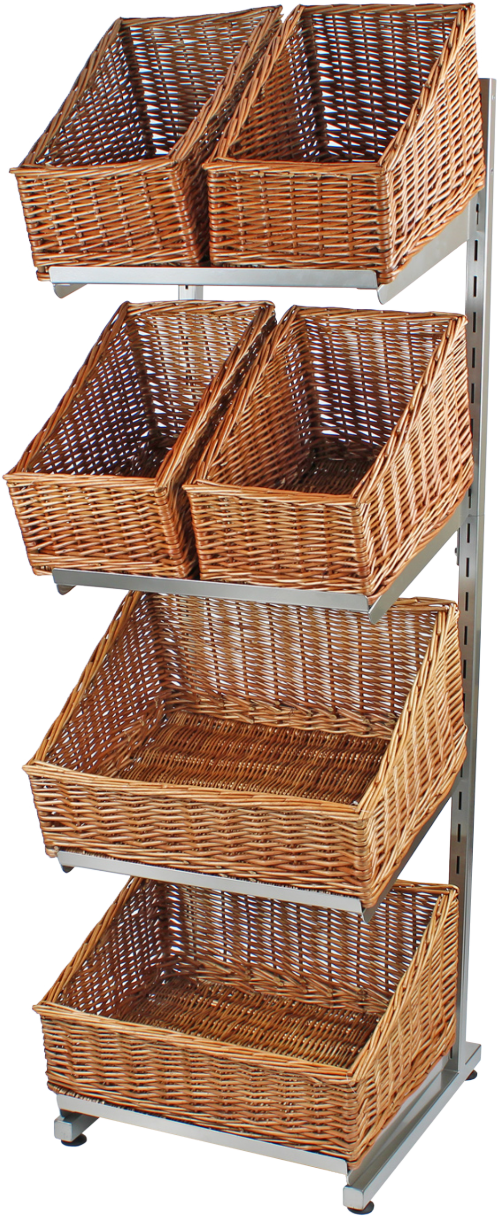 You'll also get a selection of deep sloping wicker baskets - four (w)25cm and two (w)50cm. The baskets are all finished to an incredibly high standard. They're designed to withstand the wear and tear of life in a busy retail setting. They fit on top of the shelves seamlessly. As they do not need to be fixed into place on the shelves they're easy to remove for quick restocking. Use to display a range of merchandise including fruits and vegetables, gifts and more.