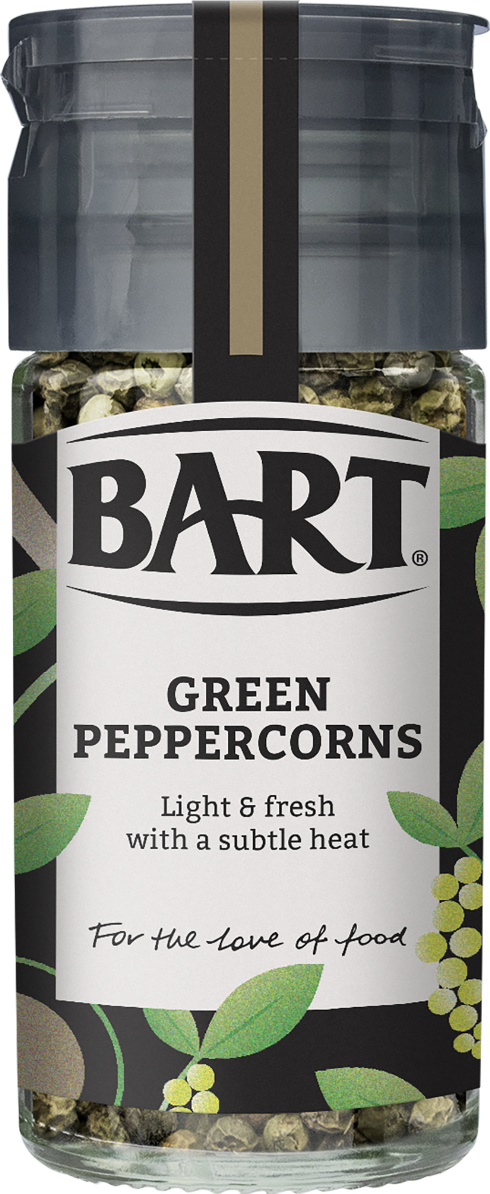 With their light aroma and fresh, mildly hot flavour, green peppercorns are ideal for steak dishes. Grind in a pestle and mortar before mixing with olive oil and rub onto beef or tuna steaks before frying. Pop a handful into boiling water with chopped celery and carrot when cooking a ham.