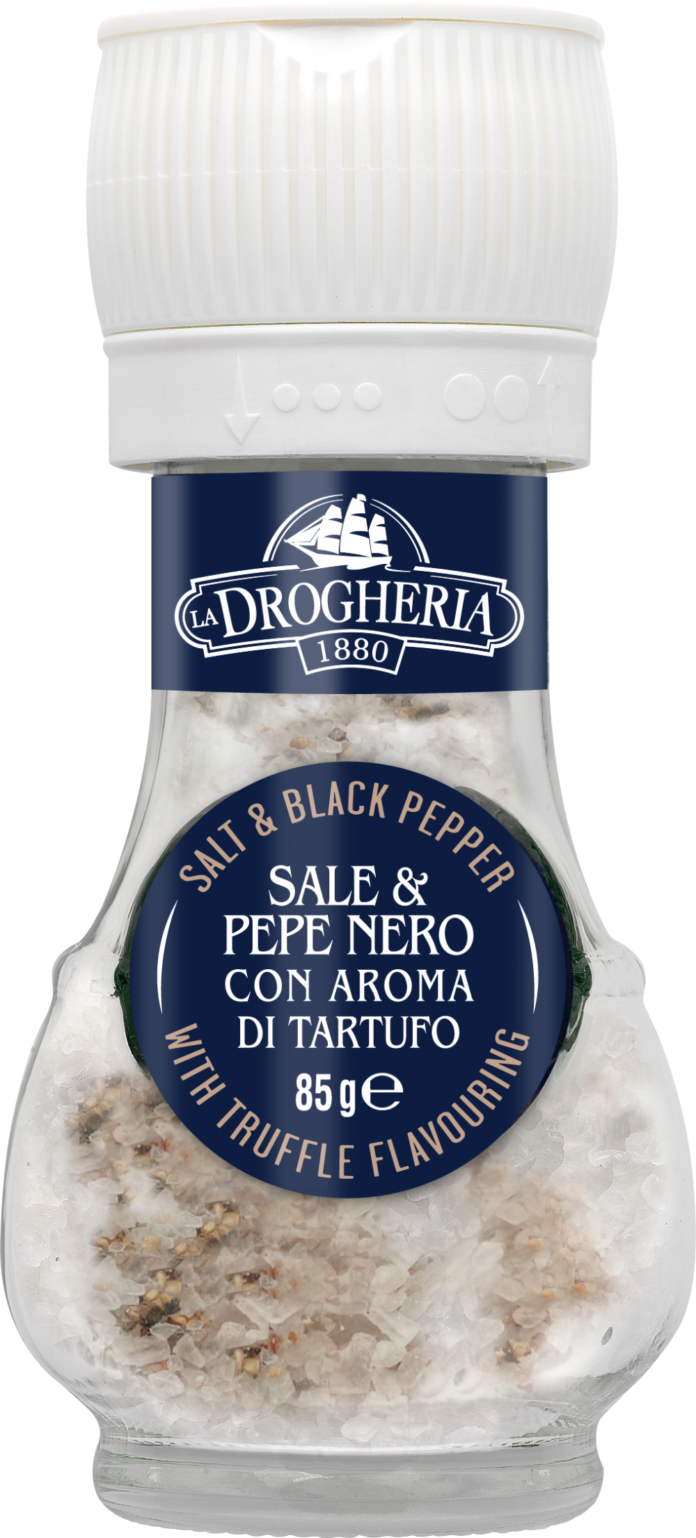 Salt & Black Pepper with Truffle Flavouring Mill 85g from La Drogheria.
