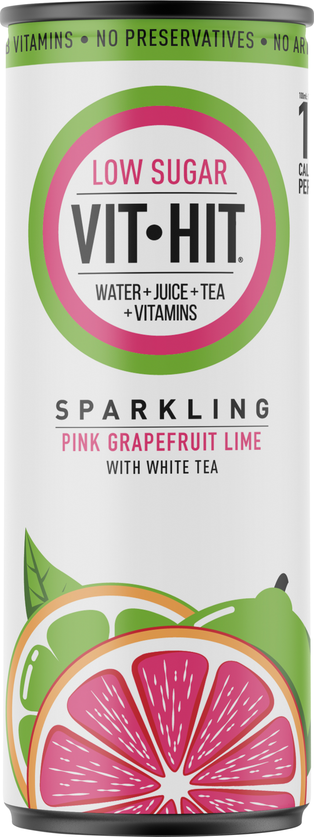 Lightly sparkling Pink Grapefruit & Lime is a delicious blend of fruit, fused with sparkling water and a powerful burst of white tea. Each can of Sparkling VITHIT has less than 6 grams of sugar and fewer than 35 calories! With no artificial colours or preservatives, VITHIT is a great source of your daily vitamins! It's time to get fizzical with this bubbling beauty!