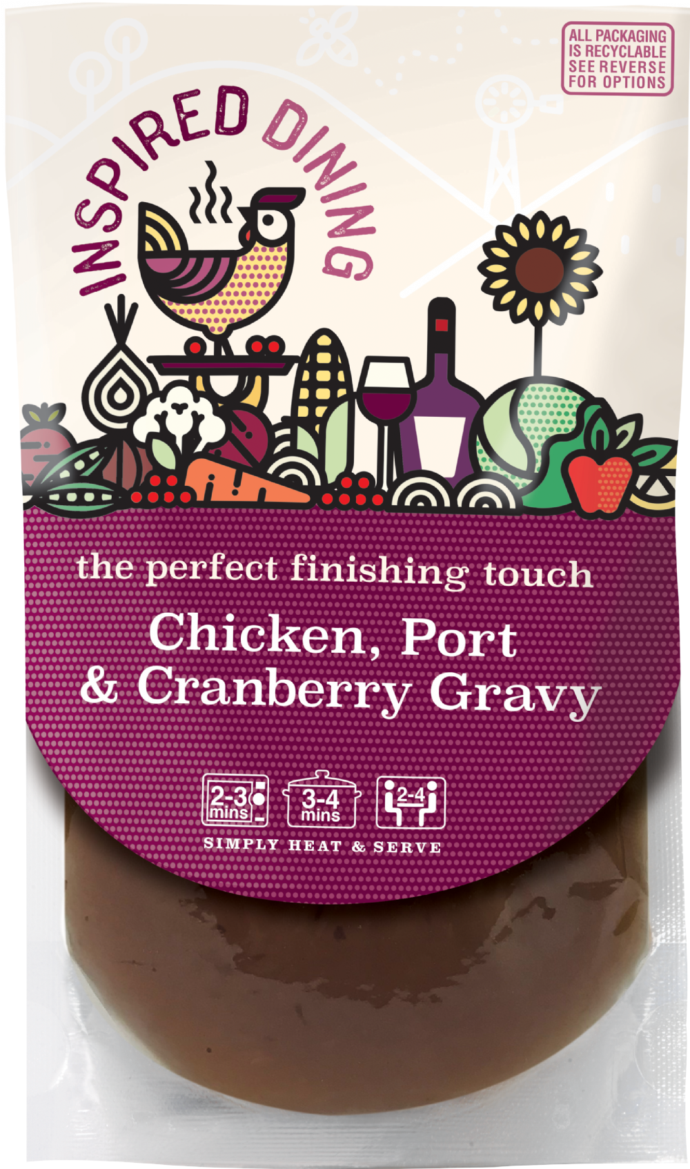Water, Chicken Stock (6.5%) (Chicken, Yeast Extract, Salt, Chicken Fat, Vegetable Powders (Leek, Onion), Sugar, Lemon Juice Concentrate, Black Pepper, Sage Oil), Cornflour, Cranberry Sauce (3.2%) (Cranberries, Sugar, Water), White Wine (Contains Sulphites), Onion, Port (1.5%) (Contains Sulphites), Rapeseed Oil, Sugar, Vegetable Stock [Dried Vegetables (Potato, Onion, Leek, Celery), Carrot Concentrate, Sugar, Sunflower Oil, Lemon Juice Concentrate], Lemon Juice Concentrate, Yeast Extract.