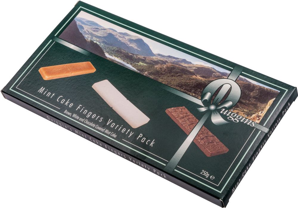 Quiggin's famous Kendal mint cake presented in an attractive gift box. Contains brown, white and chocolate covered varieties.